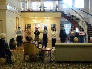 午前中は数字のプレゼンテーションの練習と、老人ホームで歌う「カエルの歌」と「森のくまさん」の練習をしました。それから Green River College に行きました。少しの時間でしたが、留学をしている友達に会えたのでよかったです。お昼は前日買ってもらったサラダを食べました。とても大きかったので Alissa に驚かれました。老人ホームは予想以上に豪華でびっくりしました。プレゼンテーションや日本の歌を歌ったときもしっかりと聞いてくれ、嬉しかったです。