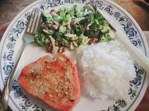 夕食はマグロのステーキでした。いつもマグロは刺身で食べるので、また違った味を知ることができてよかったです。