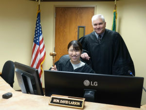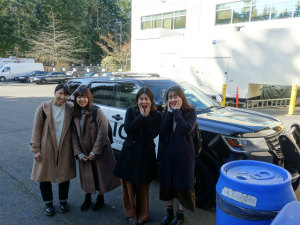 午前中は警察署と裁判所を訪問しました。警察署では女性警察官から説明してもらい、白バイやパトカー、留置所を見学しました。裁判所では、裁判官のコートを着させてもらいました。説明は難しかったので、あまり理解できませんでした。