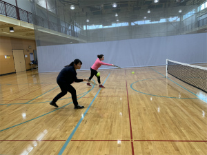 午前中はみんなでピックルボールをしました。ピックルボールはテニスに似たスポーツで難しかったです。途中から何人かやってきて、その方たちと一緒にプレーをして楽しみました。ピックルボールは年齢に関係なくできるので、高齢の方でやっている人も多いと言っていました。