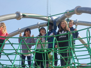昼休みには子供たちと一緒に遊具で遊びました。私たちにわかりやすく、珍しい遊具の遊び方を教えてくれました。子供たちはとても元気で、ついていくのに必死でした。