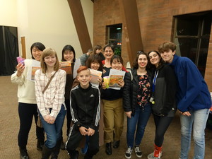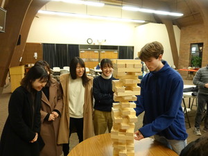 その後に、スタディセンターでウェルカムパーティーがありました。パーティーが始まる前に美香のホストチルドレンとみんなで巨大なジェンガで遊びました。いつ崩れ落ちるかヒヤヒヤしました。そして各ホストファミリーの方々が手作りの料理を持って来てくれたのでそれらを食べました。ピザやマカロニアンドチーズ、チキン、サラダ全て美味しかったです。最後にゲームをして私と遥南が同点で勝ちました。とても楽しかったです。