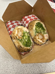 基地内には買い物ができる小さなモールもあり、フードコートには日本料理と中華料理専門のファストフード店も入っていました。「スシブリトー」と書いてあった料理がすごく気になったので買ってもらって食べてみましたが、アメリカのお寿司にしては珍しく、海苔が外側に巻かれた太めの海苔巻にエビフライとレタス、甘辛いタレで味付けされたご飯が入っていました。お寿司と言われるとほど遠いですが、韓国料理みたいな味がしておいしかったです。フードコート以外にも雑貨や家具、洋服に空軍グッズのお土産などいろいろなものを買える場所があり、買い物できる最後のチャンスだと思いたくさんお土産を購入しました。
