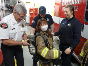 に行きました。消防車にはたくさんの機械、ハンマーやロープが積まれていて、とてもかっこよかったです。消防士が活動するときに着用するコートを着ました。コートはとても重くて、その上からガスボンベなども背負って活動すると聞いてあまりの重さに驚きました。これらを背負って活動している消防士はかっこいいなと思いました。