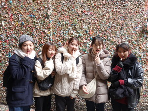 に行きました。パイクプレイスマーケットでは、有名なガムウォールを見ました。名の通り、壁一面に嚙み捨てたガムが貼り付けられてあってとても汚かったです。授業でパイクプレイスマーケットについて調べていたので、実際にスタバ一号店やフィッシュマーケットを見ることができて嬉しかったです。