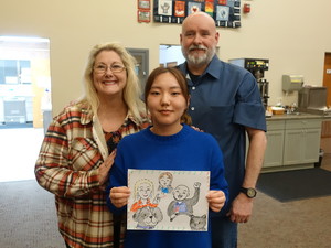 を描いて、自分のホストファミリーを紹介するコーナーがありました。私はピックアップトラックの車内で音楽を聞いている私たちとペットの犬と猫の絵を描きました。上手に描けて、ホストファミリーに喜んでもらえました。