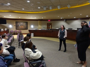 警察署へ。とても大きな建物で、かっこいい女性のスタッフの方が中を案内してくれました。まず市長に会いに行き、質問をさせてもらったり、部屋を見せてもらったりした。その後警察署長の部屋を見せてもらって、ピンバッジをもらいました。用意した質問リストを使い、質問したりバイクを見せてもらったりもしました。その後建物を出て同じ敷地内にある裁判所へ行きました。再び質問リストを使って裁判官の方々に質問して、裁判官のローブを着せてもらって裁判官になりました。帰るときにボールペンなどのお土産をもらいました。