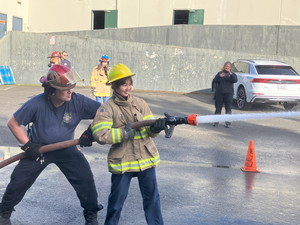 へ行きました。まずは用意していった質問をいくつかしました。難しい単語がたくさんで聞き取りに苦戦しましたが、普段聞けないようなことを聞くことができてとても興味深かったです。そのあとは、実際に消防車と救急車に乗せてもらいました。車内にはたくさんのものがあり、初めてみるものばかりでした。消防服を着て放水体験もしました。水の勢いで、体勢を保つのが大変でしたが、貴重な経験ができて、とても楽しかったです。