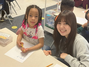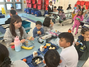で数字のプレゼンをしました。小学生みんな元気いっぱいで、楽しそうにプレゼンを聞いてくれました。一人ひとりに、カタカナでの名前の書き方を教えてあげました。教えるとすごく喜んでくれて、私もうれしかったです。お昼も小学生たちと食べました。たくさん動いて話して疲れましたが、すごく楽しい一日でした。