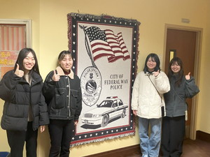 フェデラルウェイの市役所に行きました。警察署や裁判所も入っていてとても大きな建物でした。警察官に質問をしたり、一緒に写真を撮ってもらったりしました。女性の警察官も何人かいてかっこよかったです。同じように裁判官にも質問をしましたが、説明は難しく、あまり理解できませんでした。最後に、市長