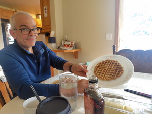 は一つひとつどんなものかを説明してくれました。帰り道に、コーヒーショップで抹茶ラテを買ってもらいました。家に帰ると John がワッフルを焼いてくれたので、買ってきたメープルシロップをワッフルにかけて食べました。
