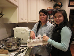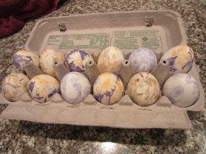 イースター ジーナは私が3月末に帰ることを知っていたので、早めにイースターエッグを作りました 。卵に絵を描いたり、色を付けたりしました。写真はシルク生地の布を卵に巻きつけ、茹でて色を付けたものです。 |