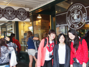 オリエンテーション最終日は、バスで一日シアトルに行きました。ダウンタウンやチャイナタウンで自由行動をしました。写真は、パイクプレイスマーケットにある、スターバックス1号店です。 |
