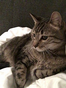 Cammy は人見知りでとてもおとなしい猫でした。ホストファーザーのことが大好きで、他の人にはあまり懐いていませんでした。最初の頃はあまり姿も見せずにいましたが、慣れてくると私のベッドにあがって寝ていたり、勉強中に机に乗ってきて邪魔をしてくるようになりました。私がベッドにいると一緒にあがって私のひざの上に乗って甘えてくれて、とてもかわいくて何時間もずっと眺めていられました。いつも癒してもらっていました。 |