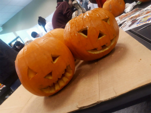 ジャック・オー・ランタン 授業の一環として、みんなでジャック・オー・ランタンを作りました。ヘタの部分をカットして中身を出す作業からしました。みんな思い思いの作品を作っていて、皆の作品を見るのは楽しかったです。ちなみに、私はそのランタンを家の前に飾らせてもらいました。私が住んでいた家の周りは、蜘蛛の巣風にデコレーションがされてたり、骸骨がいたり、暗くなってから家の前を通るのを少しためらってしまうほどの立派な飾りつけがたくさんされていました。日本とは少し異なるホラーを感じました。 |