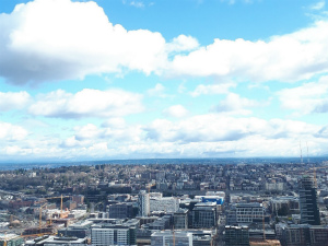 スペースニードル シアトルのシンボルといえばスペースニードル。スペースニードルを見る機会はたくさんあったけれど、実際にのぼる機会はなかなかありませんでした。しかし、学校のイベントとしてスペースニードルツアーがあり、通常料金より安くのぼれるということで参加してみました。高さは184メートルで、そんなに高いわけではないのですが、私たちが行った日は、ちょうど晴天だったためシアトルをよく眺めることができました。 |
