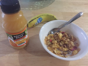 朝食は主にシリアルかパンに、ヨーグルト、バナナなどを食べていました。私は甘いものがあまり得意ではなかったので、最初の頃はシリアルがとても甘く感じ苦痛でしたが、慣れればなんてことなかったです。 |