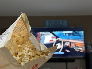 | 家でポップコーンを食べながら Netflix を見ています。(基本アメリカの家には電子レンジでつくれるポップコーンが置いてあるみたいです) |